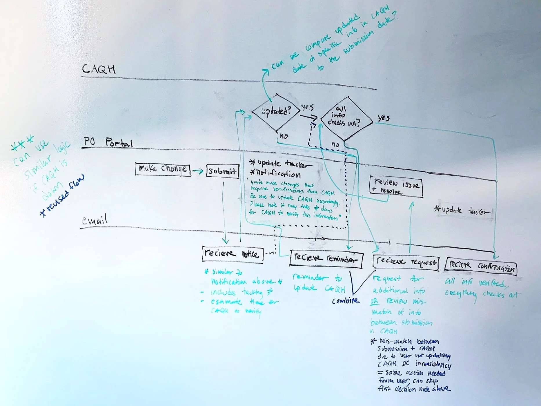 This project was a highly collaborative effort including a UX researcher, a design manager, a visual designer and myself. Working without a detailed design system, this allowed me the freedom to iterate and explore different concepts for workflow management, and form design. Due to differing regulations and requirements across states, one significant challenge was figuring out how to best organize information and adapt the UI according to which state a provider is practicing and credentialed at. If the provider has a CAQH account, required information will be auto-filled into the form. However, working within the constraints of both the third-party API and our own legacy databases certainly required me to get creative when dealing with potentially incorrect, incomplete, duplicate and mismatched data. The concept for the form design was inspired by the “rocket mortgage” vertical wizard.